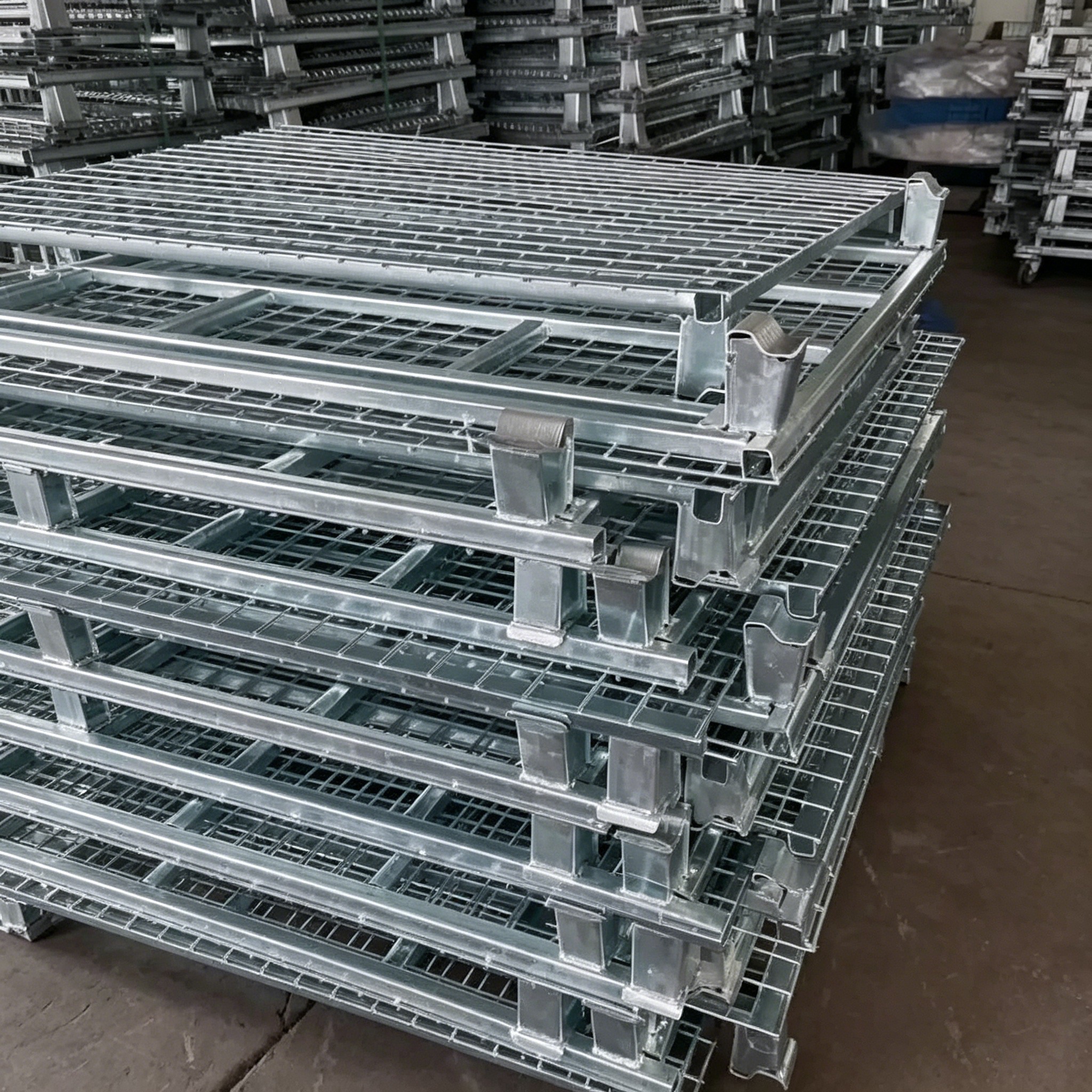 •Eficiência do espaço: Suporta empilhamento estável de 4-5 camadas quando totalmente carregado; o layout de armazenamento tridimensional aumenta a capacidade efetiva do armazém em mais de 30%.maximizar a economia de espaço de armazenamento quando as gaiolas não estão em uso.